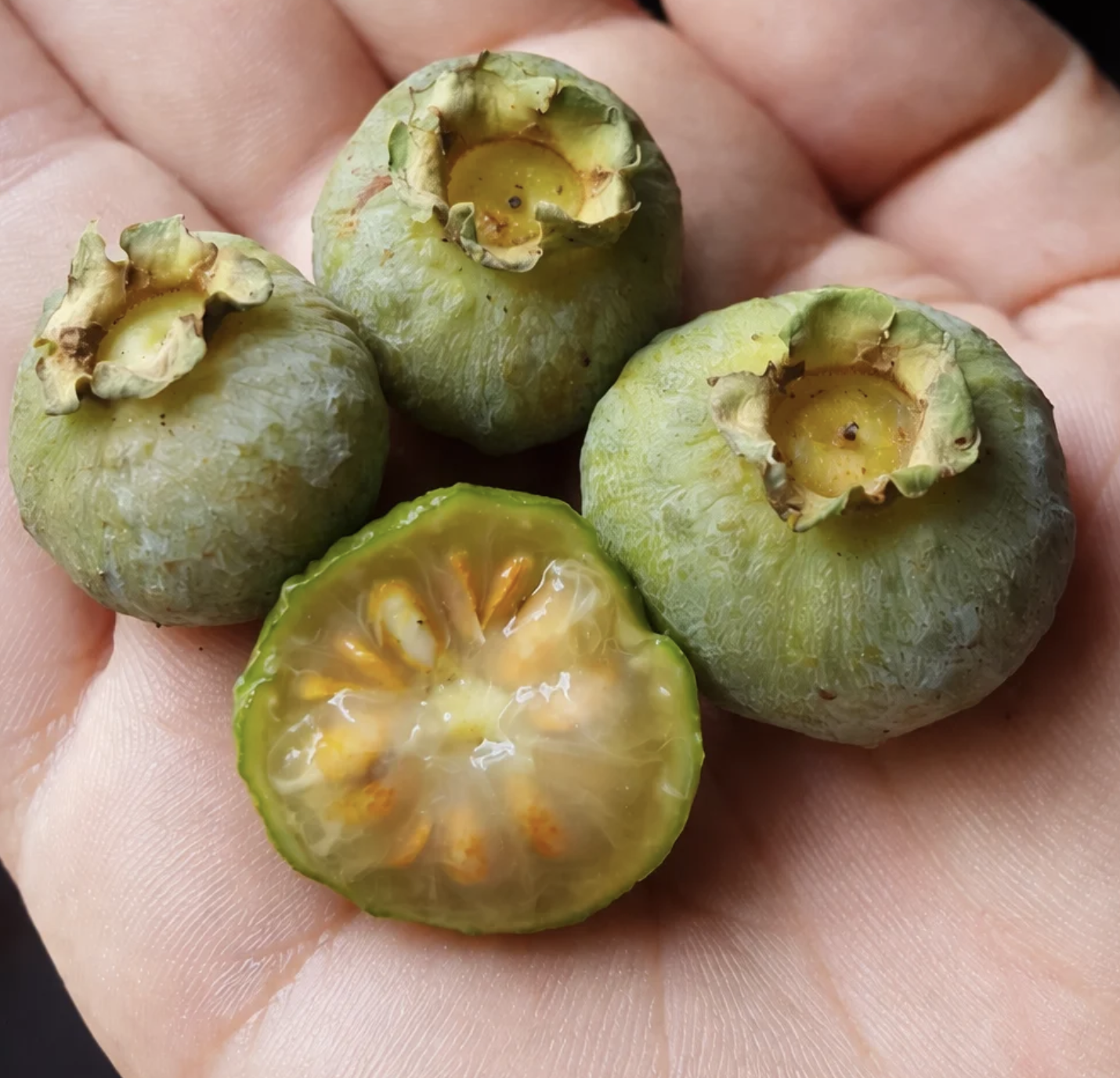 Plody jsou kulaté až 3 cm veliké, zpočátku zelenomodré, po dozrání zářivě žlutooranžové. Jsou vynikající k přímé konzumaci. Dužina je šťavnatá, aromatická a svou chutí připomíná marakuju. Plody se konzumují bez slupky která je hořká.