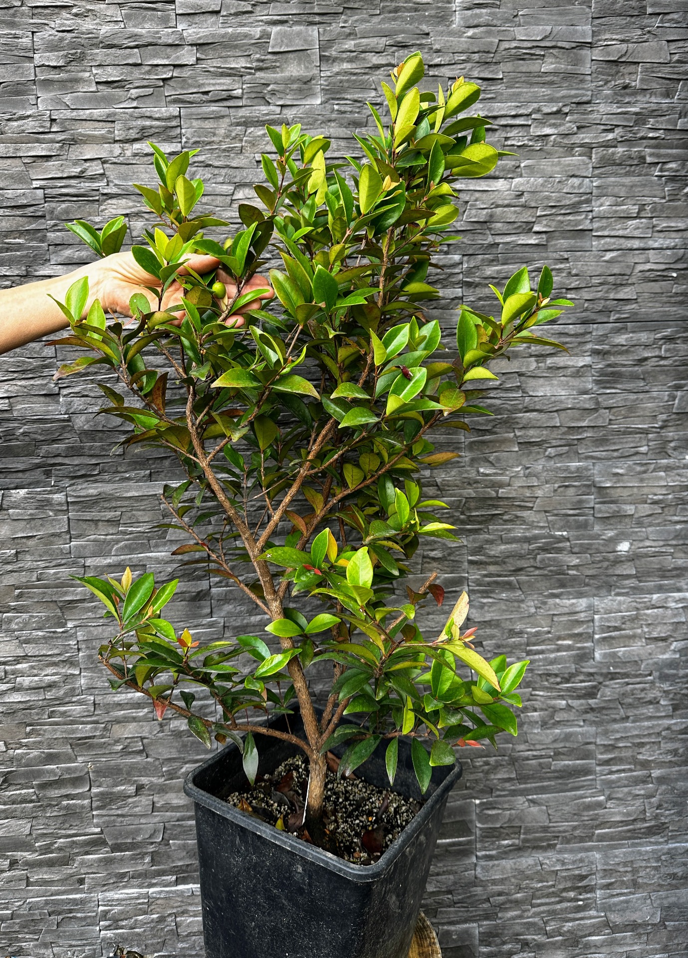 Cedar Bay Cherry is an evergreen shrub or small tree with compact growth. When grown in a pot, it remains in size up to 70 cm and is easy to shape. Shiny, dark green leaves give the plant an elegant appearance all year round, and during flowering, small white flowers with a delicate scent appear.