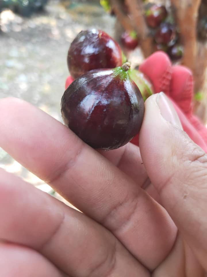 Plinia Red Pouch is a new cultivar of jaboticaba first introduced in Hong Kong in 2021. The fruits of this unique jaboticaba are up to 4 cm in size, burgundy, partially ribbed. They have a very sweet juicy pulp of excellent quality. The leaves are flat dark green with a deep main groove with smaller secondary veins