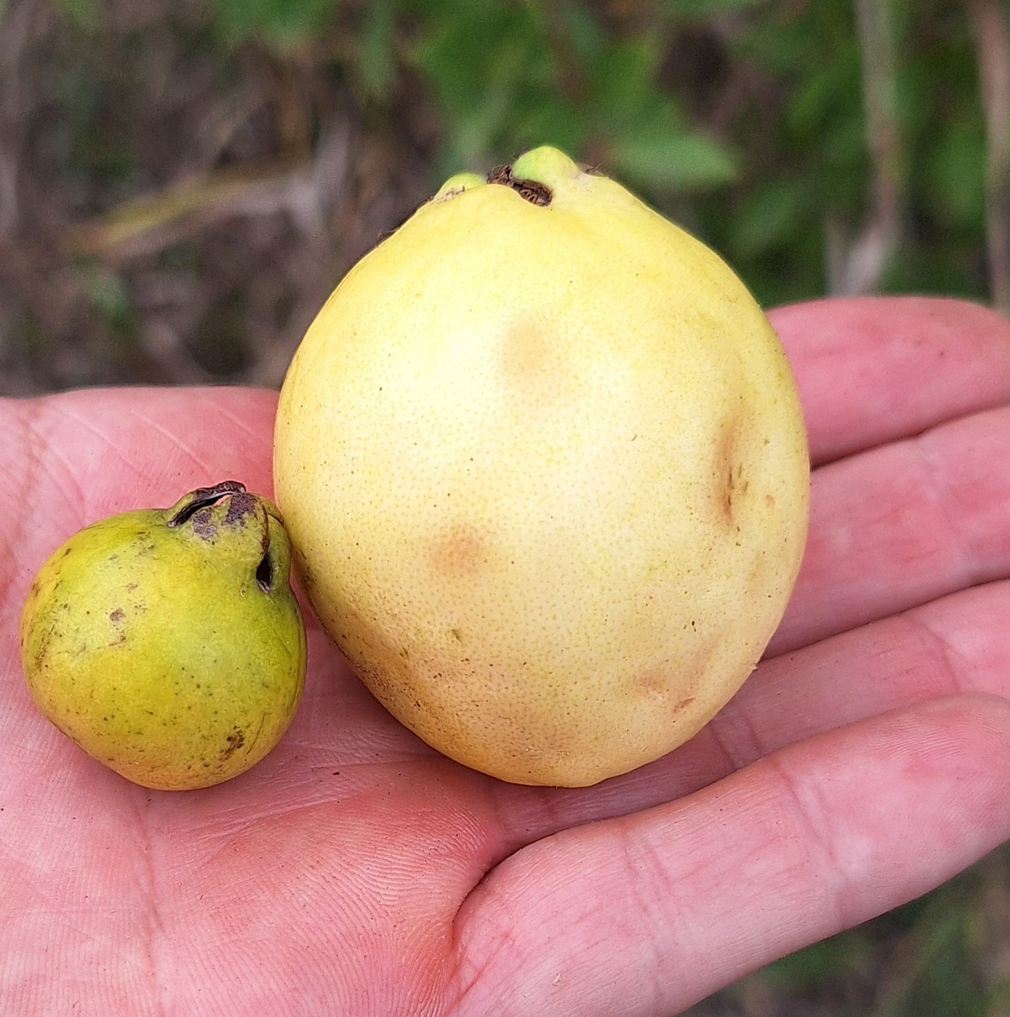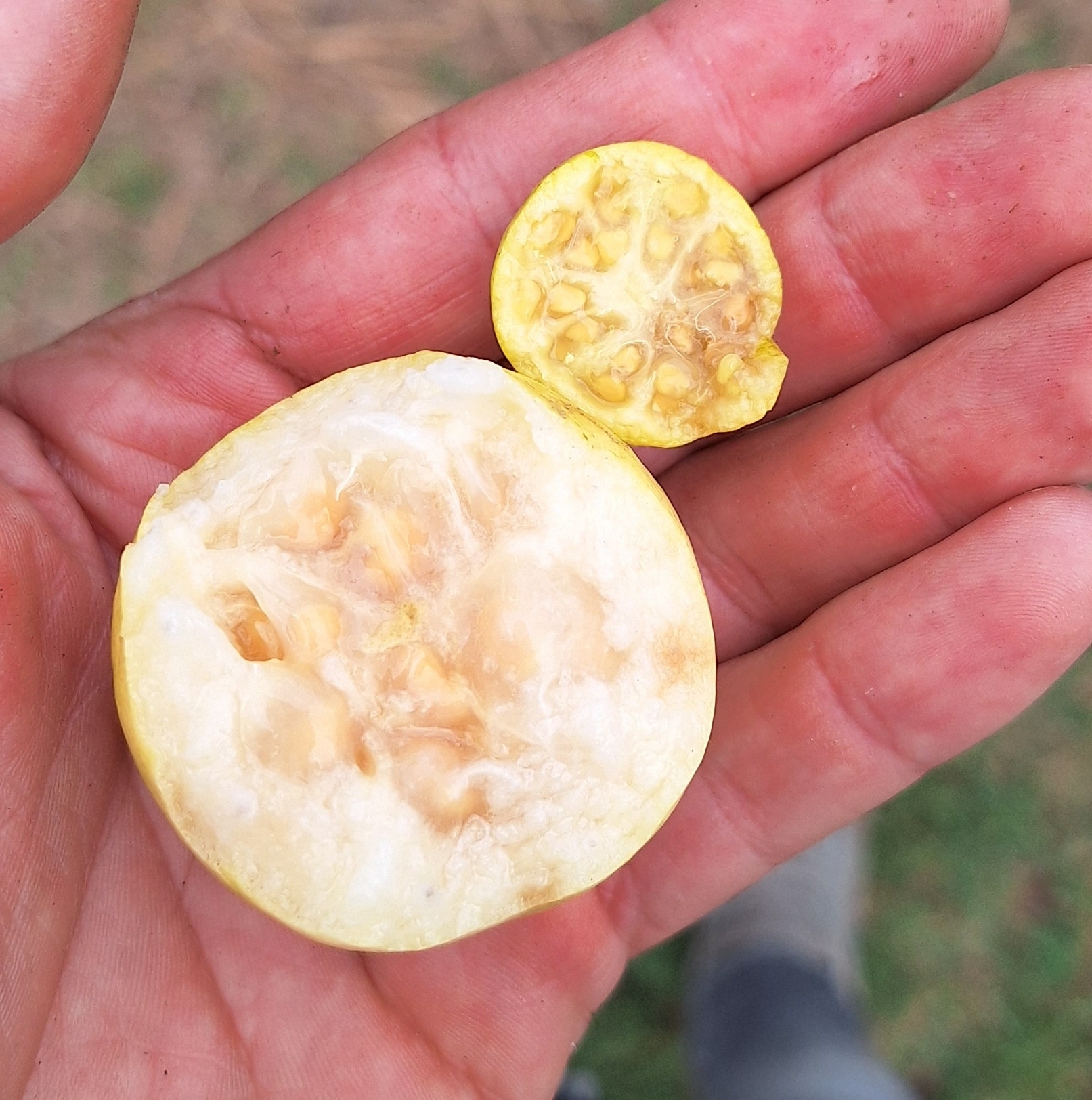 Guava Araçá-Açú vytváří žluté až zelenavé kulovité plody o velikosti 4–8 cm- jednou tak veliké plody oproti psidium Cattleyanum jak je patrné na fotce...Dužnina je jemná, krémově bílá, sladkokyselá a svou chutí připomíná vzácnou směs guavy, ananasu a hrušky. Vůně je intenzivní a omamná – ještě aromatičtější než běžná guava. Ve své domovině plodí brzy – už třetím až čtvrtým rokem od výsadby.