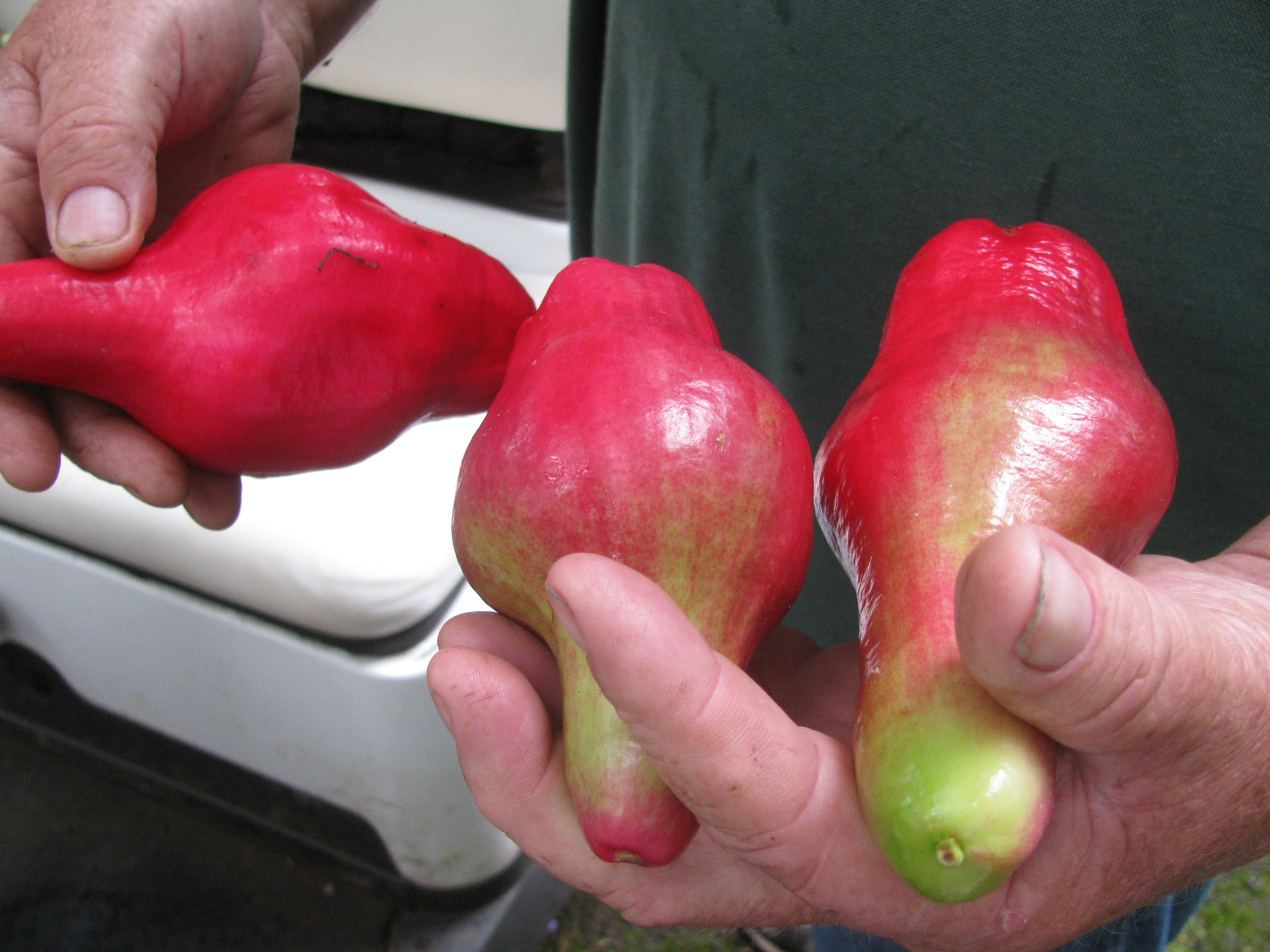Plody jsou velké, sytě růžové až tmavě červené, velikostí připomínající menší grapefruit nebo baseballový míček. Jejich dužina je křupavá, šťavnatá a osvěžující, s chutí podobnou jablku.